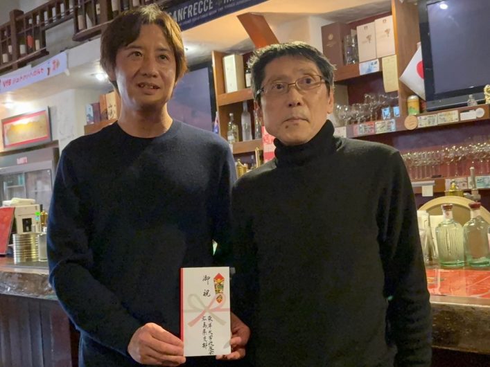 懇親会会場では、校友会広島県支部及び、甫水会広島県支部より、酒井監督へ寸志が贈られました。