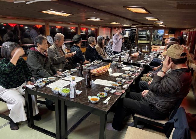 昨年に引き続き、屋形船イベント企画を担当された美尾理事が乾杯の発声をしてから、お待ちかねの会食タイムに入りました。