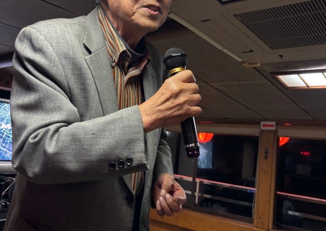 急な階段を手すりにつかまりながら、ゆっくりと船内に戻り、関副支部長が閉会の挨拶を述べ、元気よく3本で締めました。