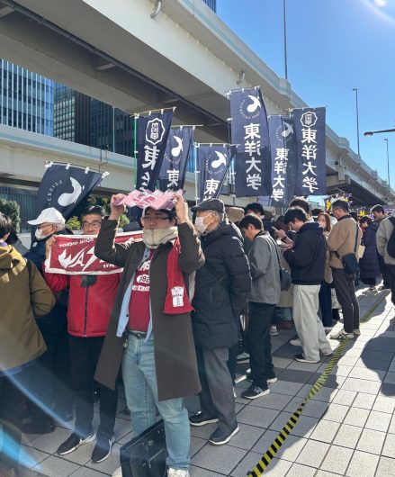 復路で崎陽軒前を通過する母校を応援するため、昨年より多い東洋大学校友会と甫水会の幟旗10本を掲げました。
