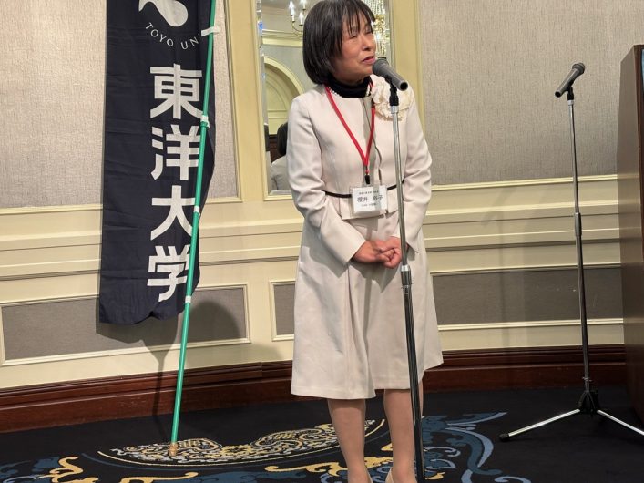 高橋一男東洋大学名誉教授の乾杯挨拶(左)