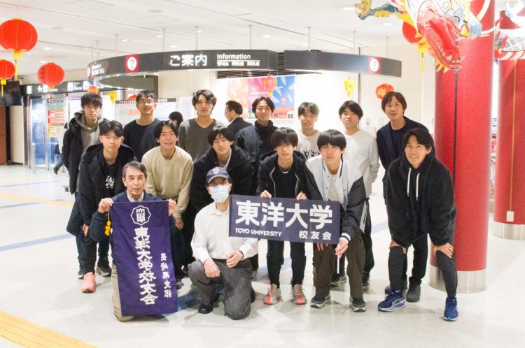 今回も、ハーフマラソンに参加される合宿中のメンバーをゴール付近で街頭応援します。(校友会の旗が目印)