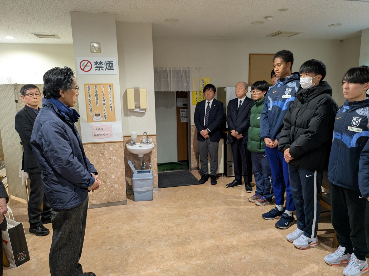 佐藤支援コーチと大西コーチから、箱根駅伝は6名を変更する非常事態の中、総合9位で20年連続のシード権を獲得できたことは良かったが、本来なら上位で走れるチームである。これからも切磋琢磨しながら上位入賞、優勝を目指していくと力強いご挨拶をいただきました。