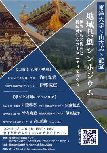 東洋大学公認団体「学ボラ」は、設立20周年を迎えました。これを記念し、発足の契機となった2004年の中越地震で甚大な被害を受けた旧山古志村と、現在、復興支援が求められている能登半島をテーマに、シンポジウムを開催します。