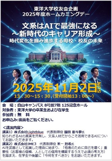 表題に「文系」と入っていますが東洋大学の卒業生ならどなたでもご参加いただけます!講演会の後に講演者を交えた交流会も実施いたしますので、名刺をお持ちの方はぜひご持参ください。(学生の方は不要)